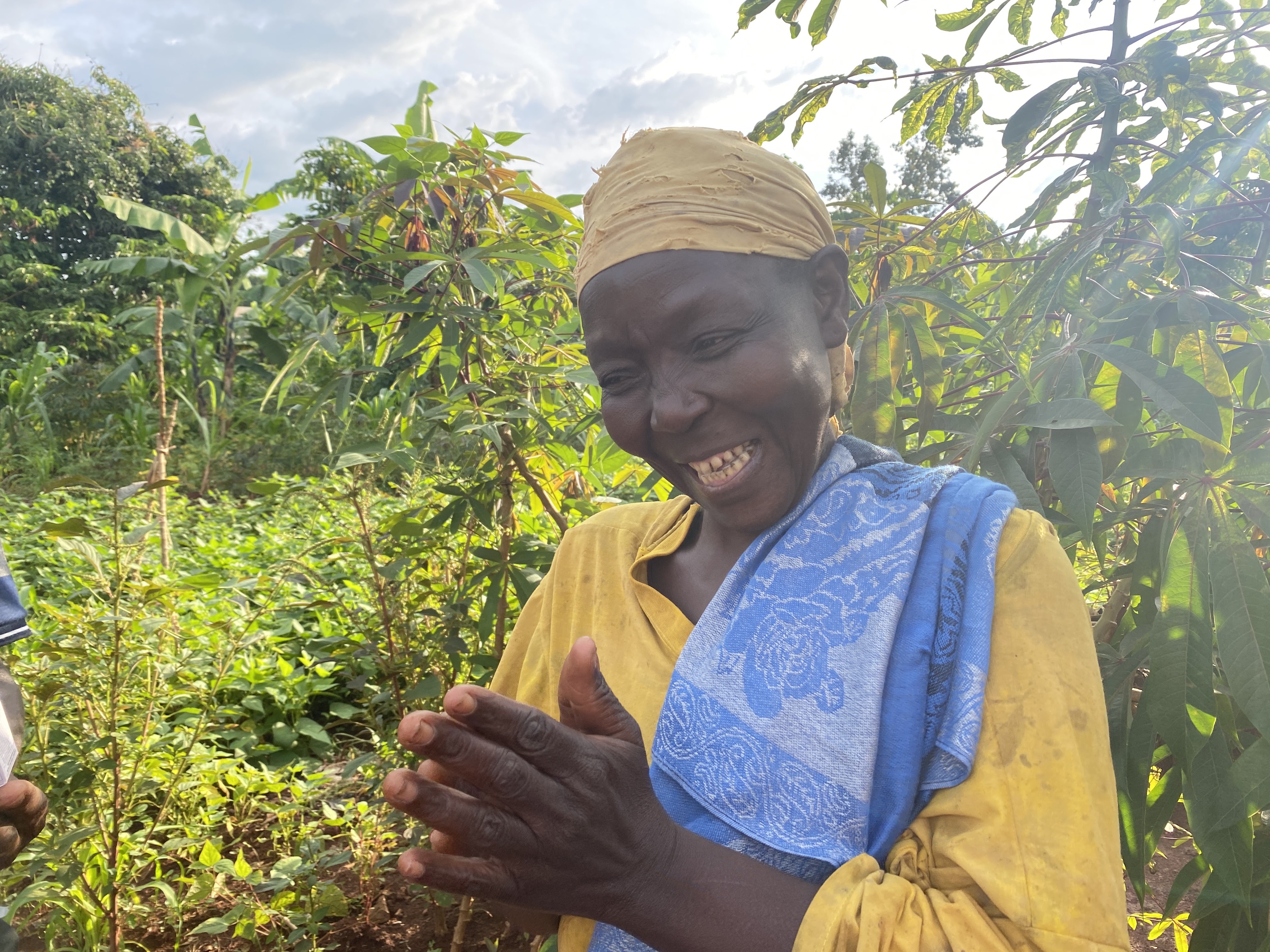 Our last visit was to Slivia, an elderly lady living on the edge of a field that she tends and grows vegetables in, habituating in structure she has built for herself. She is all alone with no family in her life but a neighbour, Anna Maria, also aged who keeps an eye on her. Slivia was married many years ago but she was “barren” and because of this her husband beat her and burnt her and threatened to end her life. So she fled in fear for her life and returned to Mpigi to a plot of land owned by her father. Today she was overwhelmed with joy she said because of all the people on the street we had chosen to visit and bless her with gifts from the church. She asked us to pray for a house for her and her health as her body is in pain.