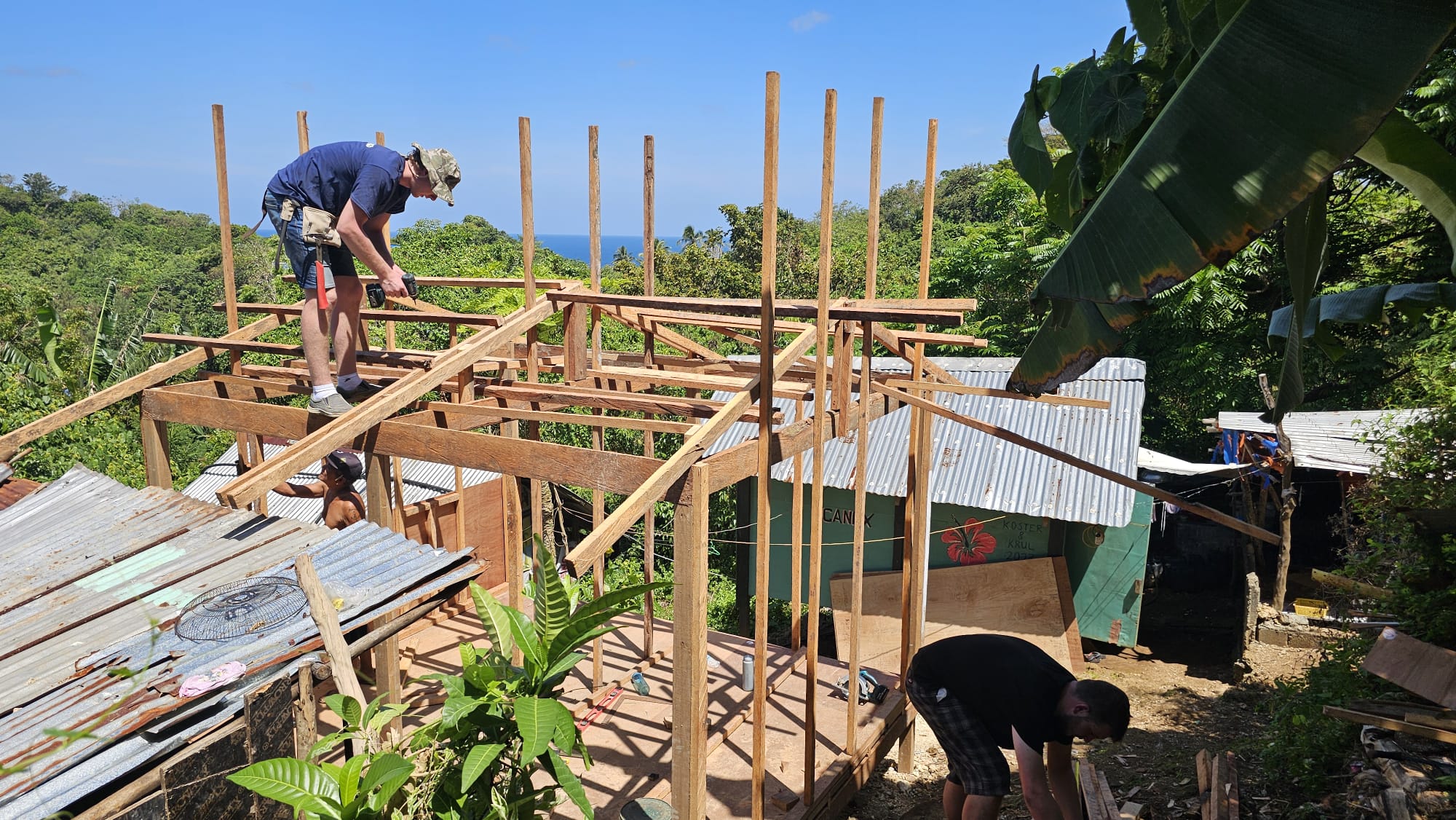 Soon after breakfast , we were back at the worksite. Today’s focus: completing the roof trusses and strapping, getting everything prepared for the tin roofing. Us white folks are not quite built for slaving in the heat!