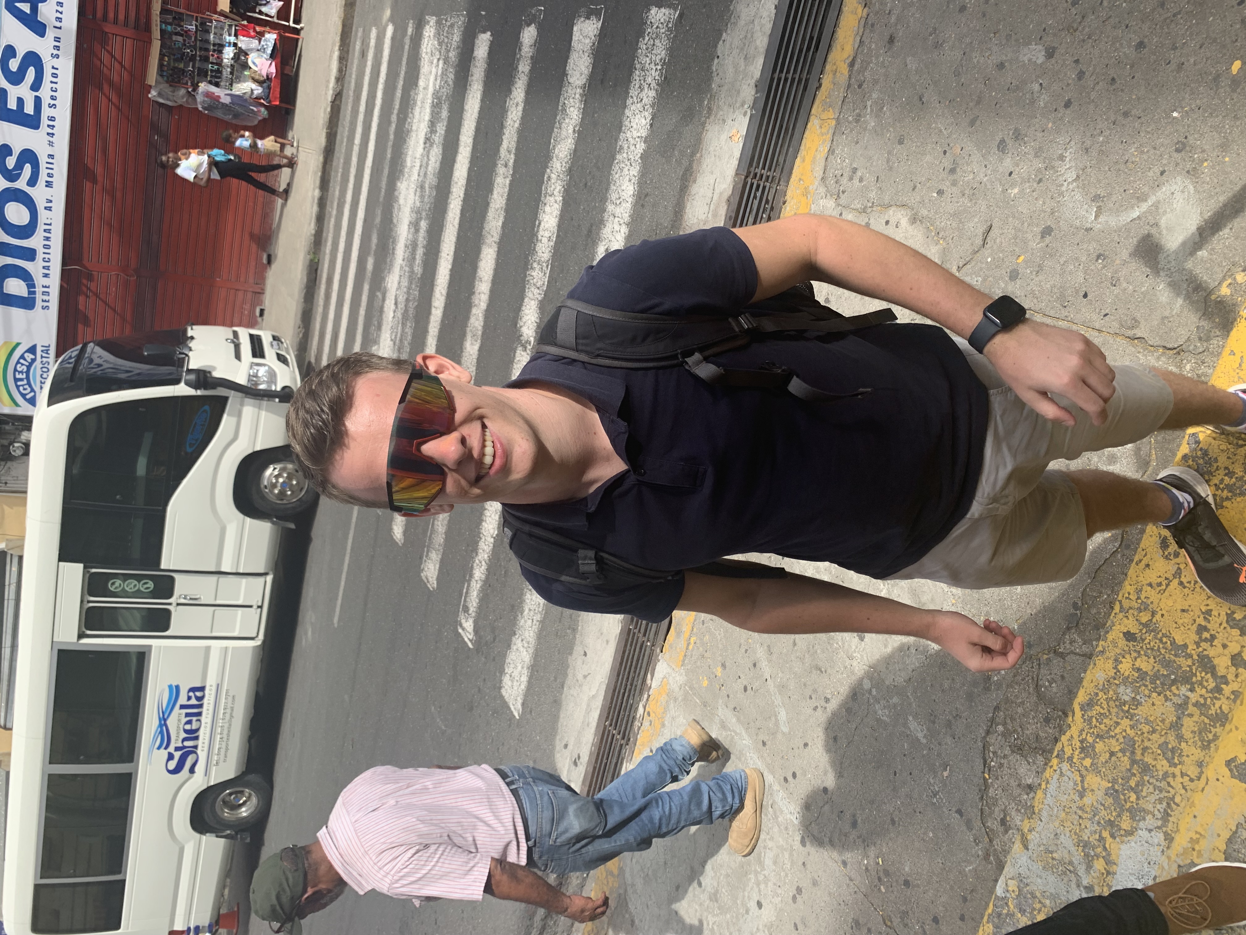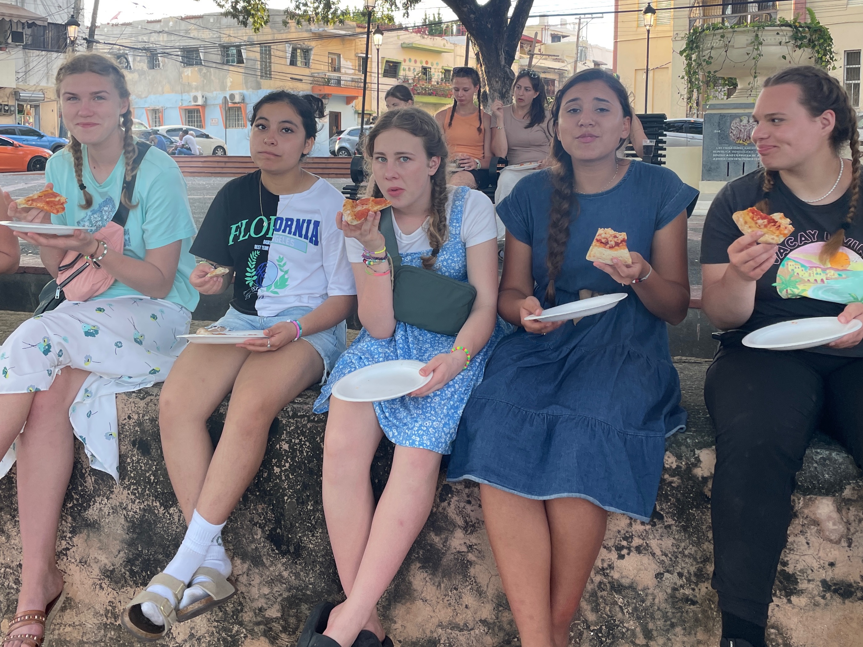Today we got to sleep in a bit since there was no school and breakfast was pushed to 8:30. It was hard for Sean today because he injured his foot last night while playing volleyball. The girls were all over him (caring for him😁😁😁). He accepted their help with open arms. After breakfast we visited the Mc Millan goat farm. Later on we painted the volleyball court lines, with which the students were very happy. After a delicious lunch provided by our lovely cooks we took a forty minute drive with great Spanish and praise music to a market in Santo Domingo. We were split up into groups and bartered with the mertiants for souvenirs. Thankfully we had locals with us because some of the blancos had no clue how to barter and would have been totally scammed. We had an amazing tour in the Colonial Zone in Santo Domingo with Jonathan as our guide. We stopped at a park and had pizza for dinner, with some people from Juan Tomas. The Day came to a close with DJ Ruben on the bus (who apparently was an actual DJ, or so he says).