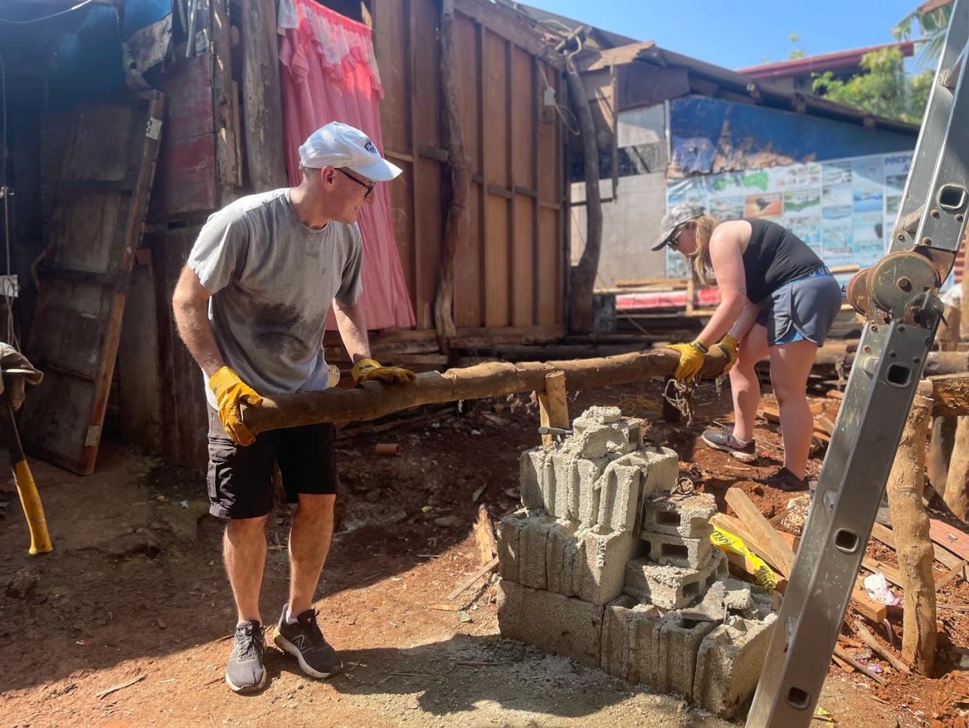 Darrin and Emily loosening a post at the demolition site