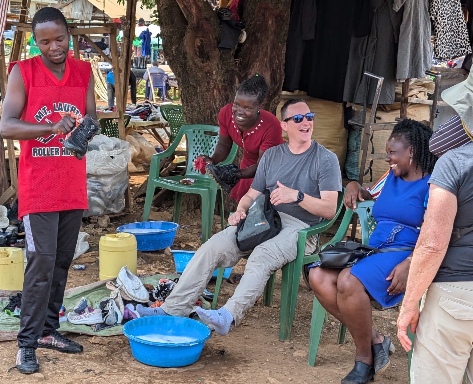 This morning, our team returned to Yogo village with a joyful mission: to treat 12 sponsored students with a special outing. We guided the children to the bustling local market, where they each selected new school shoes and a backpack. The marketplace was alive with vibrant sights and sounds—stalls filled with household supplies, clothing, fresh food, and hardware.
