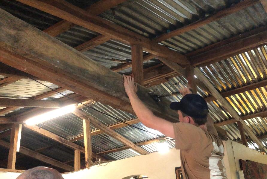 After this, the boys and girls divided and conquered the tasks that needed to be done. The guys worked at the sewing centre today, painting rebar on the roof to protect it from rusting and repairing a falling beam inside the centre. Thankfully, it was a bit cloudier in the morning, so they didn’t completely fry.