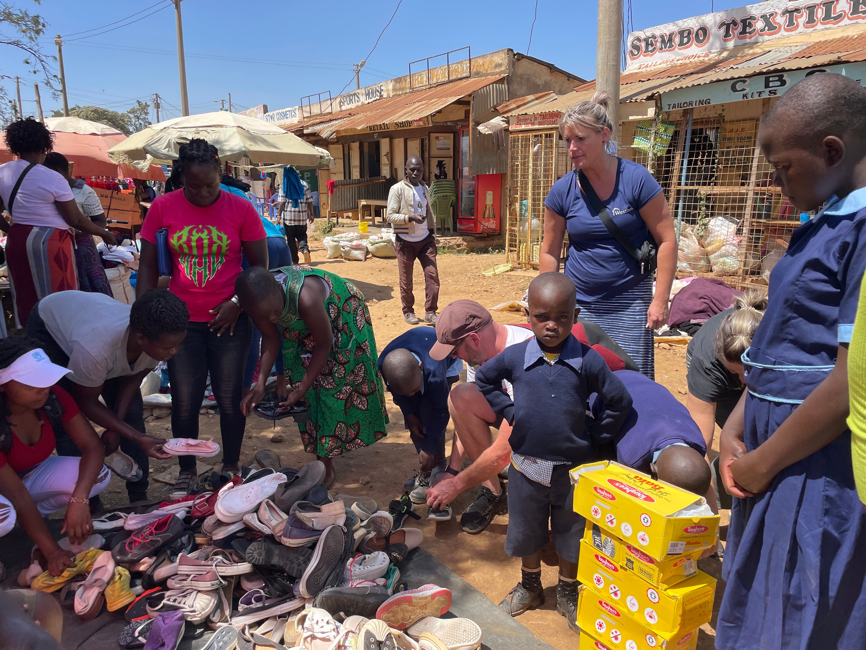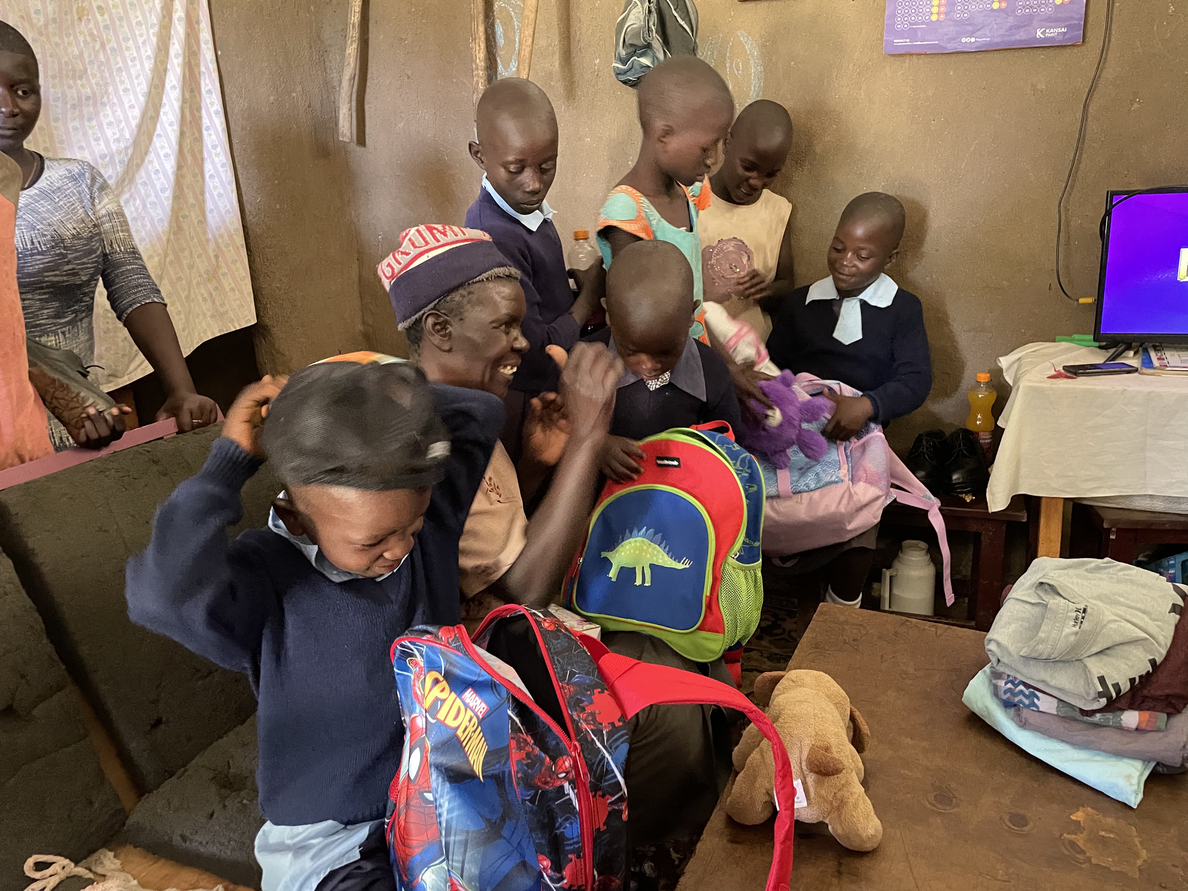 Today was such a great day! On the way to the school we stopped in at Joyce’s house to see if the gutter install was complete, while a couple of the guys helped with the eave trough, the rest of us wandered over to the neighbors house, where a lady and her 4 children were harvesting corn, so we helped them with a few stocks. Then we headed off to the school and met with all Westbow and voice of Hope sponsor children. We did update photos and info of the children. We loaded up our sponsor kids and headed into Siaya to go school shoe shopping. We found them each a pair of shinny new shoes for school and let them each pick another pair of shoes as well. We then headed across the street to get everyone some ice cream and a pop. These children had never had ice cream before, but all loved it! We then headed back to their homes, to meet with their parents/grandparents and give them some new backpacks filled with goodies. After that we headed out and went to visit 4 widows homes and gave them each some food baskets. Along the road we stopped to hand out some soccer balls and lots of sweeties (suckers). We also took a bunch of polaroid pictures, so they could have their very own pictures to keep. It was such a fulfilling day!