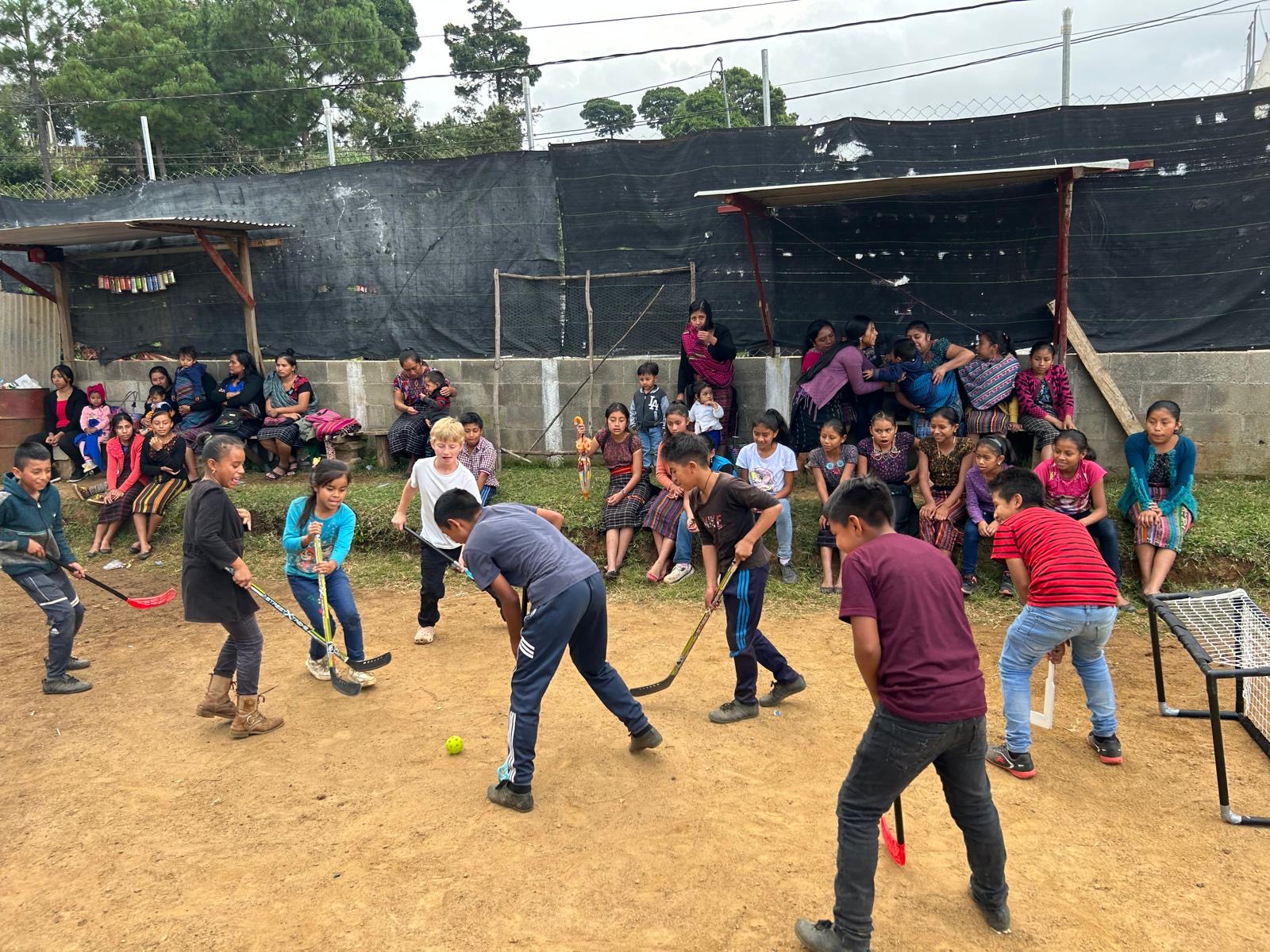 Our first stop was to meet children from Jesus Viene School, where about 90 students, ranging from elementary to middle school, gathered for their final day of the 2025 school year. The children welcomed us with music and dance performances. Following a Bible story, we set up four activity stations: bracelets and temporary tattoos, soccer, disc golf, and mini hockey. Each group rotated through the stations, and it was beautiful to see kids of all ages playing together and having fun.