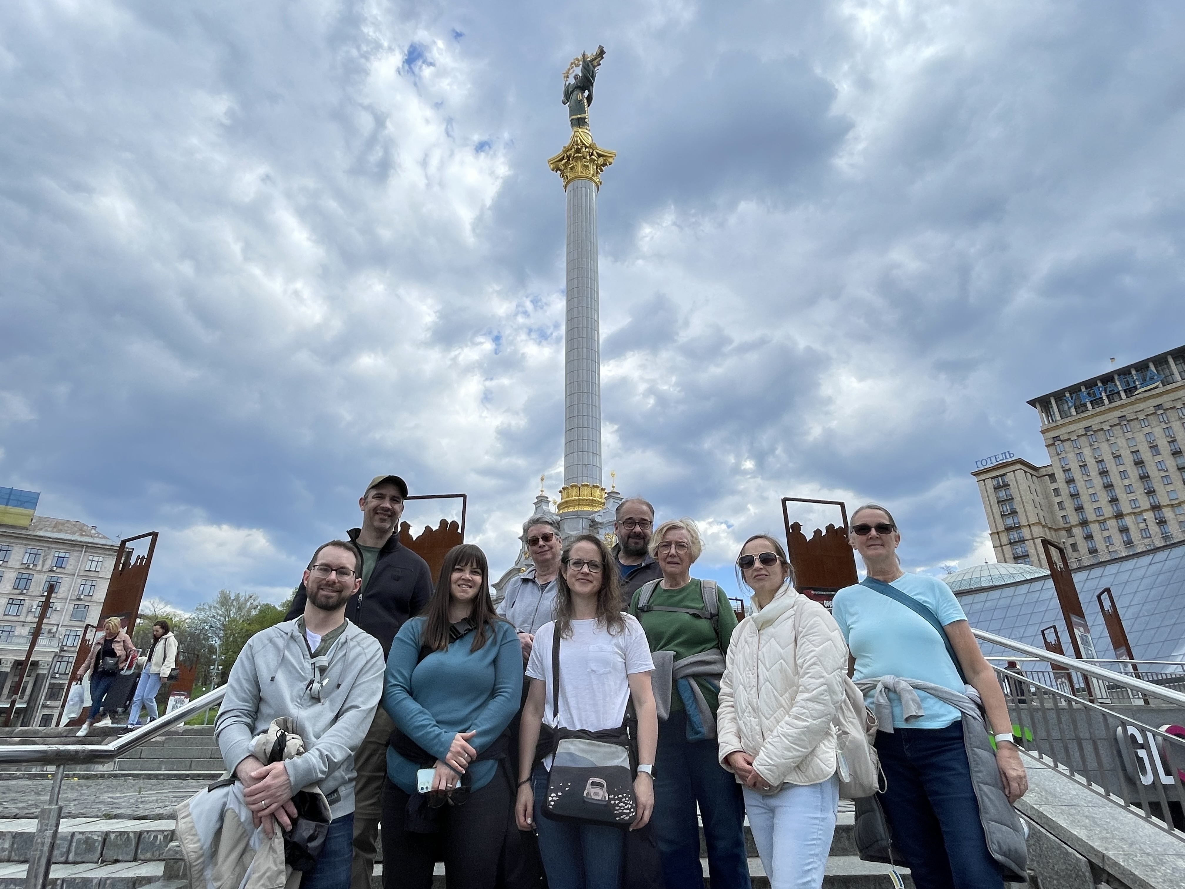 After a restful night’s sleep, we had a leisurely breakfast at the hotel before boarding the Metro (subway) to travel to downtown Kyiv. We spent our time at Freedom Square, where Mary filled us in with the history of Russia’s oppression of Ukraine, starting with the Soviet Union, then in 2014 with the annexing of Crimea, followed by the atrocities of this past year. It was a sobering reality of what these people have faced for the past decade(s).