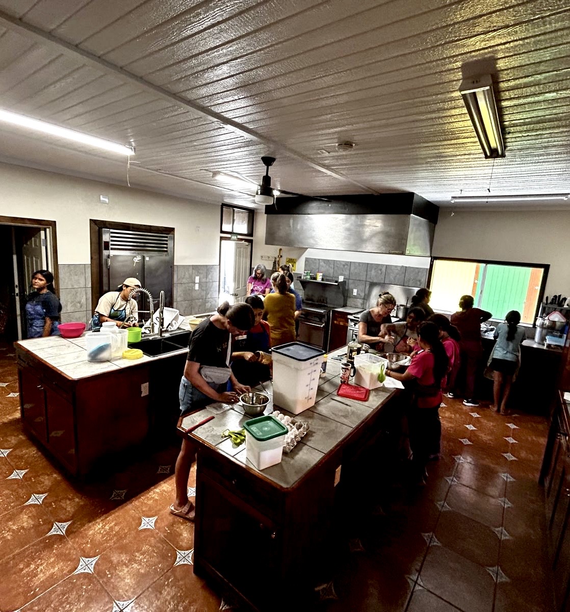We then continued the baking from yesterday, putting the cookie dough in the oven, and making some more cookies to give out in ministry the coming days. We also made Peach crumble and brownies with the girls help of course! Meanwhile part of the team packed the food hampers in a very efficient assembly line to fill 35 bags that we will hand out at the migrant camp and food program tomorrow and Saturday.